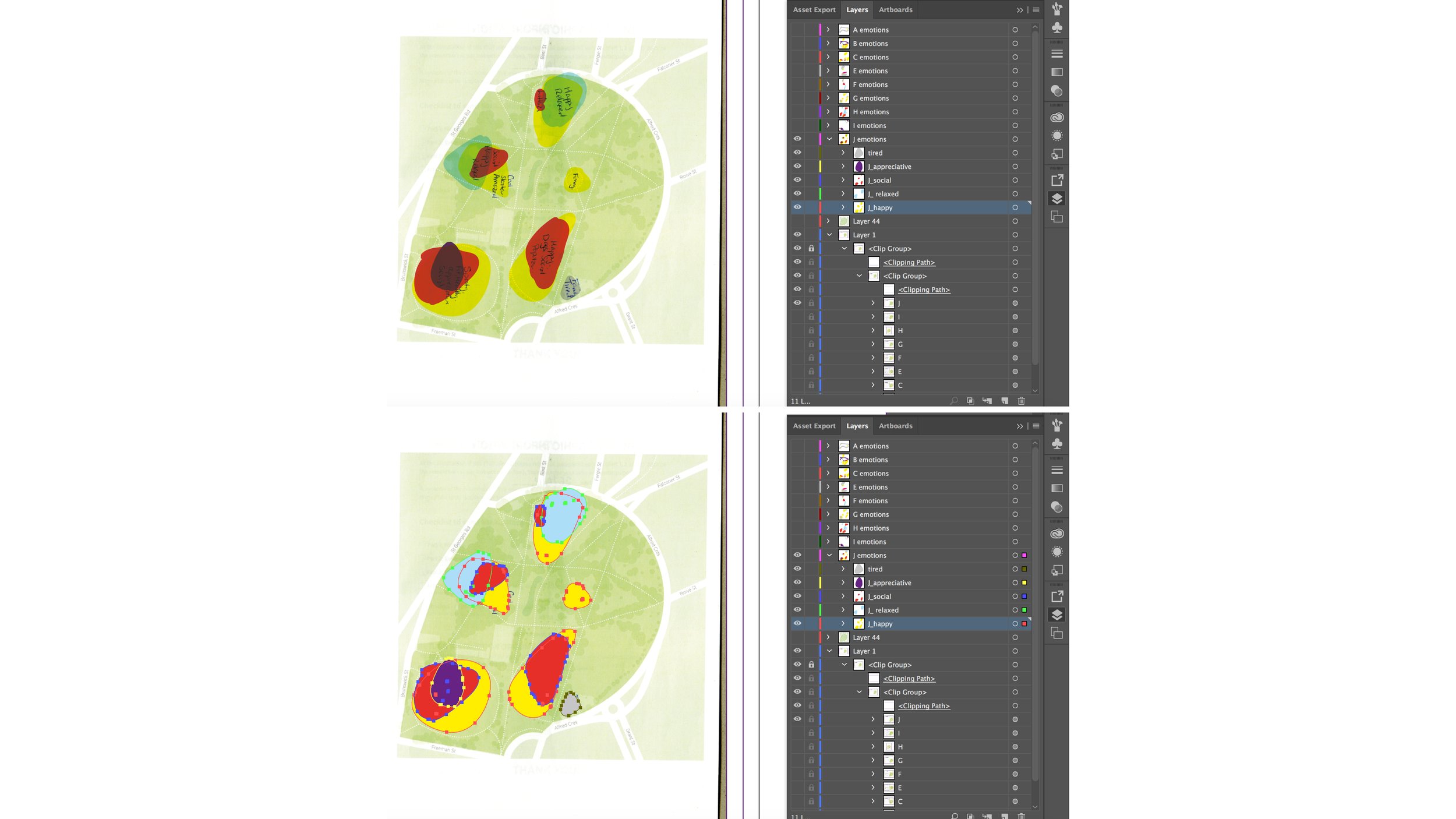 These emotion maps shared the same base map of the Edinburgh Gardens. I was able to compare each participant’s emotional point of view and perceptions of the park in specific zones within the park. The base map showed the entirety of the park, like a template, which opened the park up for participants to provide an emotional overview, not limiting the participant’s emotions to just one experience or memory of a designated area. Using Nvivo, I used the data to create categories and coded them as events, experiences (positive and negative), emotions, the body, weather, objects and moments of significance, and perceptions of the park. With these codes I could delve deeper and create nodes and tags specific to words describing the participant’s emotions, based on the data from the surveys. By generating these different groupings, I could compare the emotions and the effects of these emotions associated with these experiences.