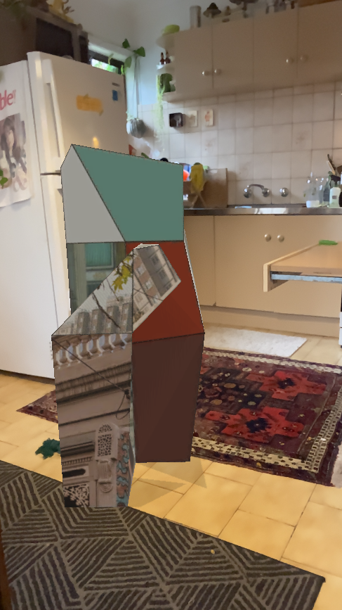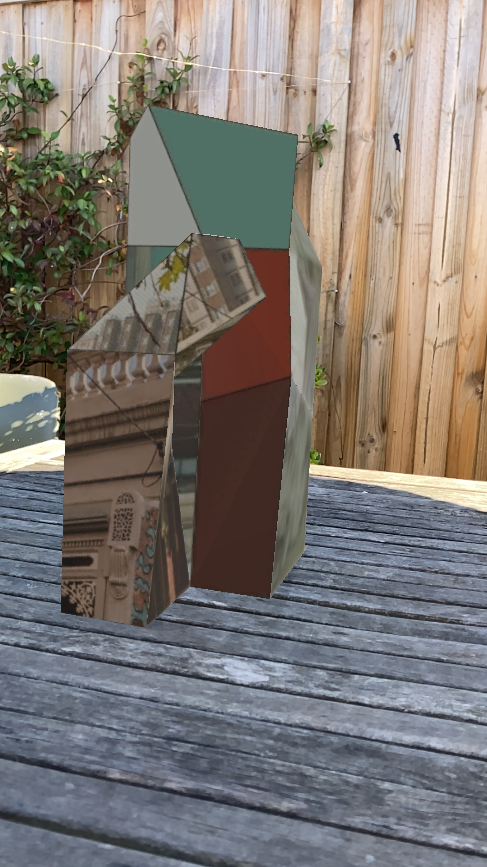 Sourced imagery was collaged and stitched together to wrap the AR cartographic artwork’s façade, with multiple photographs of the neighbourhood reflecting data-driven themes and categories. AR allows for multiple interchangeable digital façades to be overlaid onto the same digital sculpture, enabling viewers to experience shifting perceptions through their devices. This interplay between reality and augmented reality, using stitched imagery to create a new version of a landmark, immerses the viewer in an intimate experience of place. The viewer engages with place as seen from multiple photographic perspectives and through the layered perspectives of the augmented surface itself, as well as the viewer’s physical perspective on the work as it is situated in the environment. These AR cartographic artworks of new landmarks can be strategically positioned throughout the neighbourhood and scaled to any size, either by placing them in the exact locations where the original photographs were taken or by introducing them as new landmarks to new places, enhancing one’s spatial awareness and sense of place through layered, site-specific interventions.